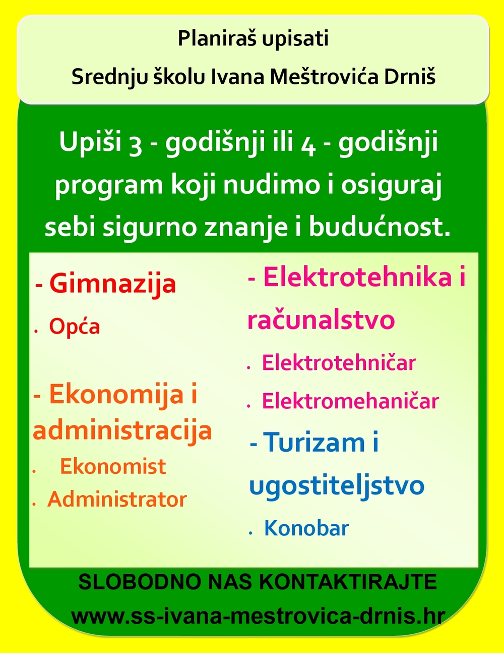 Upisi Srednja Skola Ivana Mestrovica Drnis from www.ss-ivana-mestrovica-drnis.hr Upisnice i ostali dokumenti dostavljati će se u školu od 29. Upisnica u srednju glazbenu školu šk. Liječnička svjedodžba medicine rada (troškove izdavanja plaćaju roditelji učenika).